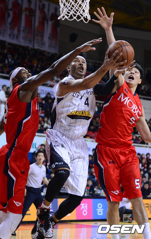 7일 오후 울산 동천체육관에서 열린 '2013-2014 KB국민카드 프로농구' 울산 모비스와 창원 LG의 경기 1쿼터 문태종이 벤슨-송창용을 피해 슛을 시도하고 있다.