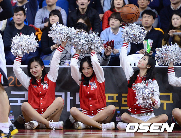 7일 오후 울산 동천체육관에서 열린 '2013-2014 KB국민카드 프로농구' 울산 모비스와 창원 LG의 경기 2쿼터 치어리더들이 앉아있는 곳에 공이 오자 박기량이 공을 쳐 내고 있다.
