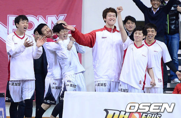 7일 오후 울산 동천체육관에서 열린 '2013-2014 KB국민카드 프로농구' 울산 모비스와 창원 LG의 경기 4쿼터 LG가 득점하자 벤치에 있던 선수들이 환호하고 있다.
