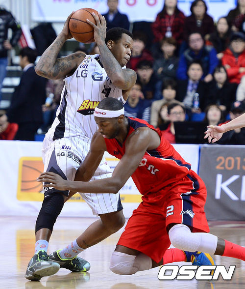 7일 오후 울산 동천체육관에서 열린 '2013-2014 KB국민카드 프로농구' 울산 모비스와 창원 LG의 경기 4쿼터 제퍼슨이 벤슨을 따돌리고 있다.