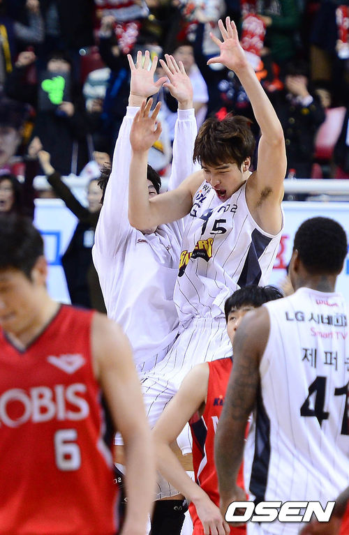 7일 오후 울산 동천체육관에서 열린 '2013-2014 KB국민카드 프로농구' 울산 모비스와 창원 LG의 경기 종료 후 김종규가 동료들과 승리를 기뻐하고 있다.