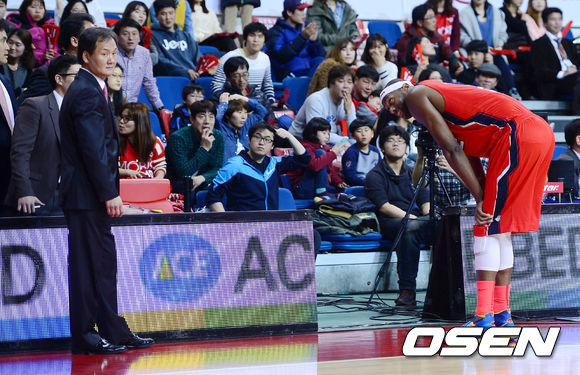 7일 오후 울산 동천체육관에서 열린 '2013-2014 KB국민카드 프로농구' 울산 모비스와 창원 LG의 경기 4쿼터 벤슨이 퇴장을 당한 후 벤치로 향하고 있다.