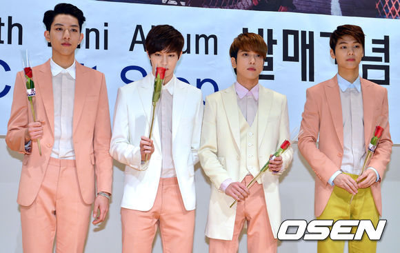 7일 오후 서울 신당동 청소년수련관에서 열린 씨엔블루 다섯번째 미니앨범 'Can’t Stop' 발매기념 팬사인회에서 그룹 씨엔블루가 꽃을 들고 포즈를 취하고 있다.