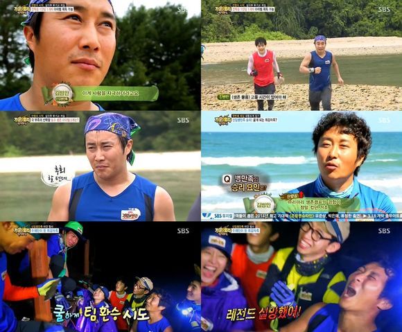 하지만 김병만은 다른 전략을 택했다. 출발 전 주위를 살펴본 김병만은 "우회로가 있었는데 바다를 헤쳐나가는 것보다 5배는 더 빠를 것 같았다"며 우회로로 전력질주하기 시작했다. 그를 따라 병만족의 멤버 동준도 우회로를 선택했다.