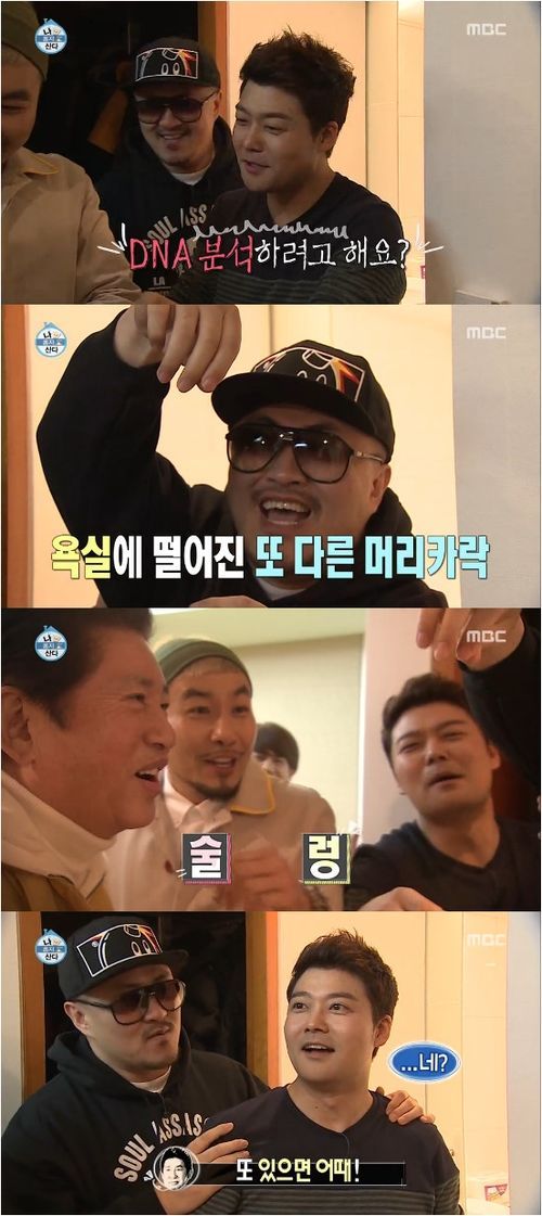 이날 멤버들은 집안 곳곳을 둘러보다가 화장실 욕조에서 긴 머리카락을 발견했다. 노홍철은 “긴 머리카락이다”고 놀려댔다. 전현무는 “겨드랑이털”이라고 말도 안 되는 변명을 했다.
