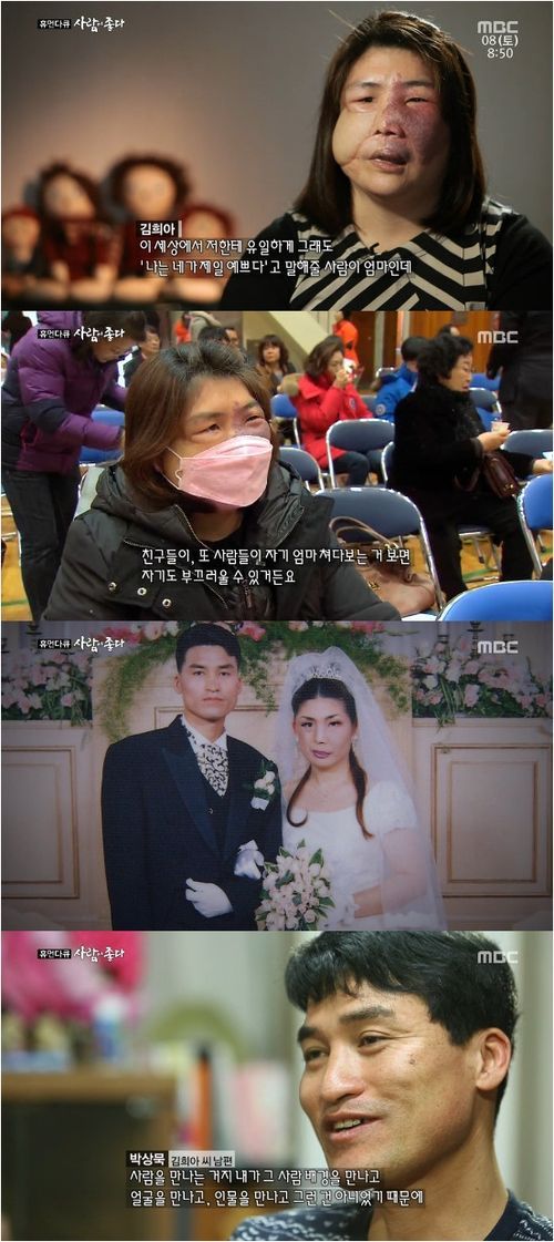 김희아 씨의 남편 박상묵 씨는 8일 방송된 MBC ‘휴먼다큐 사람이 좋다’에서 아내의 안면장애에 대해 “사람을 만난 것이지 얼굴을 보고 만난 게 아니다”면서 “단순히 그것을 알았다고 해서 헤어질 이유는 없었다”고 말했다.