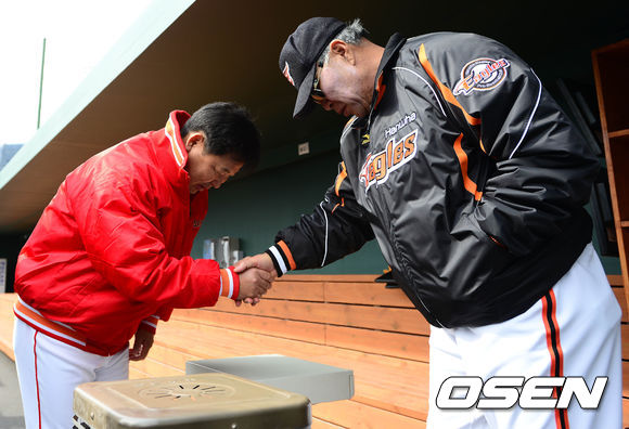 8일 오전 대전 한밭야구장에서 열리는 '2014 프로야구' 시범경기 한화 이글스와 SK 와이번스의 경기를 앞두고, 한화 김응룡 감독과 SK 이만수 감독이 인사를 나누고 있다.