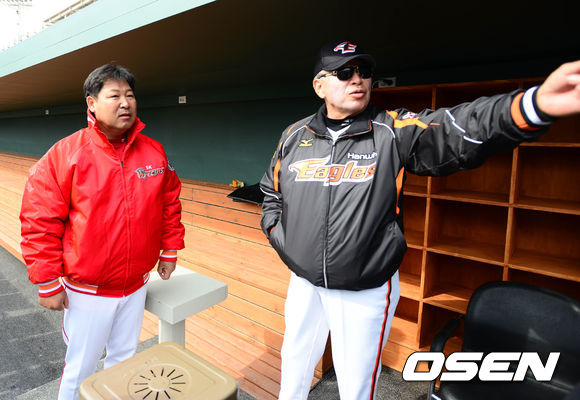8일 오전 대전 한밭야구장에서 열리는 '2014 프로야구' 시범경기 한화 이글스와 SK 와이번스의 경기를 앞두고, 한화 김응룡 감독과 SK 이만수 감독이 인사를 나누고 있다.