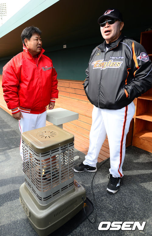 8일 오전 대전 한밭야구장에서 열리는 '2014 프로야구' 시범경기 한화 이글스와 SK 와이번스의 경기를 앞두고, 한화 김응룡 감독과 SK 이만수 감독이 인사를 나누고 있다.