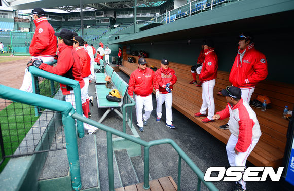 8일 오전 대전 한밭야구장에서 열리는 '2014 프로야구' 시범경기 한화 이글스와 SK 와이번스의 경기를 앞두고, 양팀 선수들이 훈련을 진행하고 있다. 사진은 훈련을 준비하며 새로워진 더그아웃을 살피고 있는 SK 선수들.