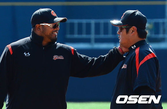 8일 오전 창원시 마산야구장에서 열리는 '2014 한국야쿠르트 세븐 프로야구' 시범경기 NC 다이노스와 롯데 자이언츠의 경기 시작전 최준석과 히메네스가 장난을 치고 있다.