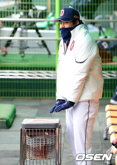 경기에 앞서 두산 오재원이 난로에 몸을 녹이고 있다.