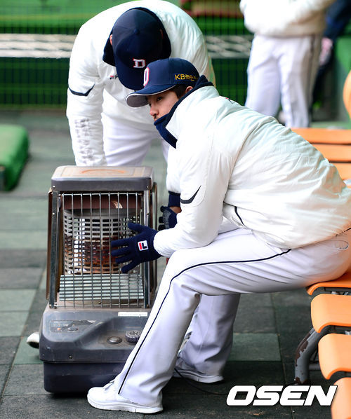 경기에 앞서 두산 오재원이 난로에 몸을 녹이고 있다.