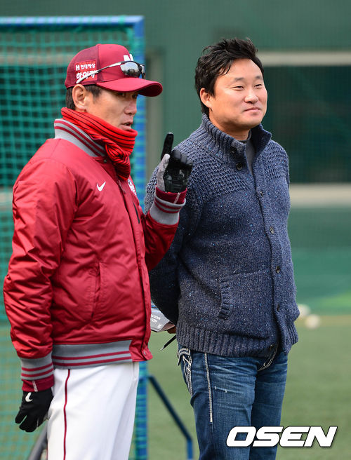 경기에 앞서 넥센 이강철 코치와 진필중 XTM 해설위원이 이야기를 나누고 있다.
