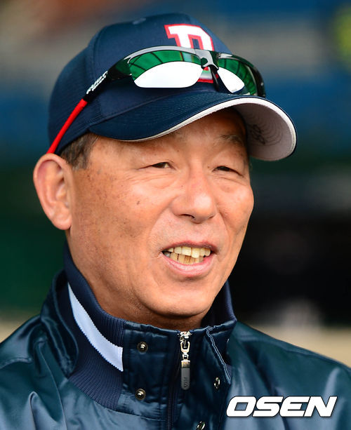 경기에 앞서 두산 송일수 감독이 취재진과 이야기를 나누고 있다.