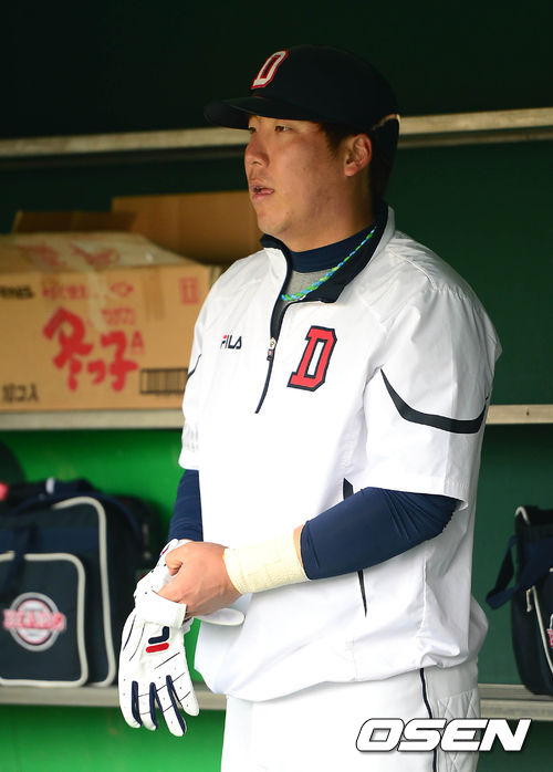 경기에 앞서 두산 김현수가 훈련을 준비하고 있다.
