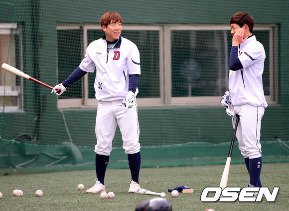 경기에 앞서 두산 김현수와 정수빈이 이야기를 나누고 있다.