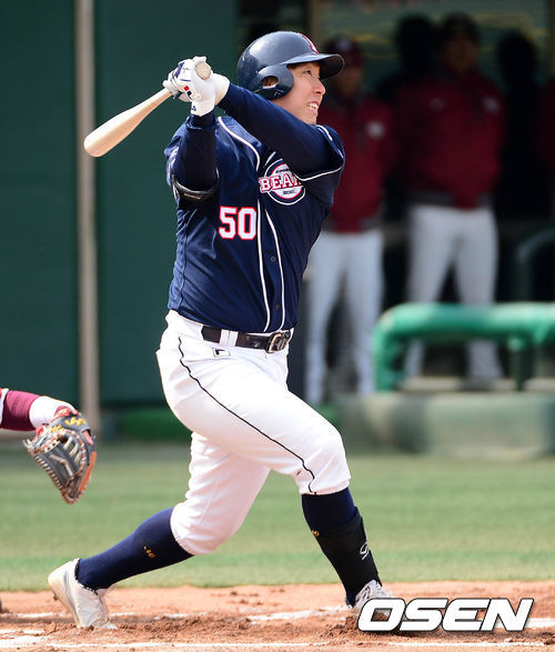 두산 베어스 외야수 김현수가 올 시즌 시범경기 1호포를 터뜨렸다.