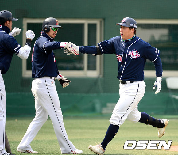 1회초 1사 1루에서 두산 김현수가 중월 투런 홈런을 치고 홈에서 오재원, 칸투와 하이파이브를 하고 있다.