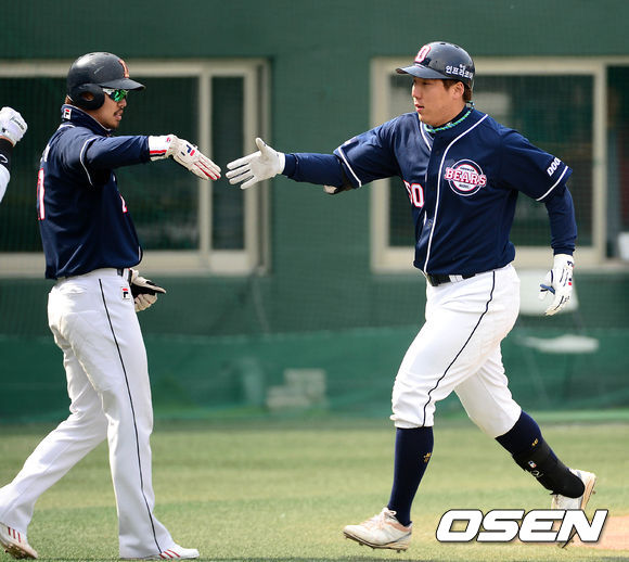 1회초 1사 1루에서 두산 김현수가 중월 투런 홈런을 치고 오재원과 하이파이브를 하고 있다.