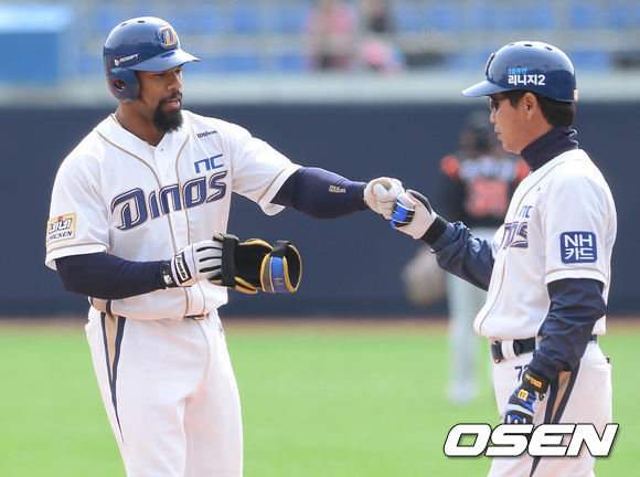8일 오후 창원시 마산야구장에서 열린 '2014 한국야쿠르트 세븐 프로야구' 시범경기 NC 다이노스와 롯데 자이언츠의 경기 1회말 1사 1루 테임즈가 우전안타를 치고 전준호 코치와 하이파이브를 하고 있다.