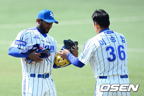 2회말을 마치고 삼성 나바로가 이승엽에 글러브를 건네 주고 있다.