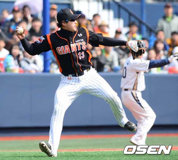 8일 오후 창원시 마산야구장에서 열린 '2014 한국야쿠르트 세븐 프로야구' 시범경기 NC 다이노스와 롯데 자이언츠의 경기 2회말 1사 1,2루 지석훈의 내야안타를 잡은 황재균이 송구 시기를 놓치고 있다.