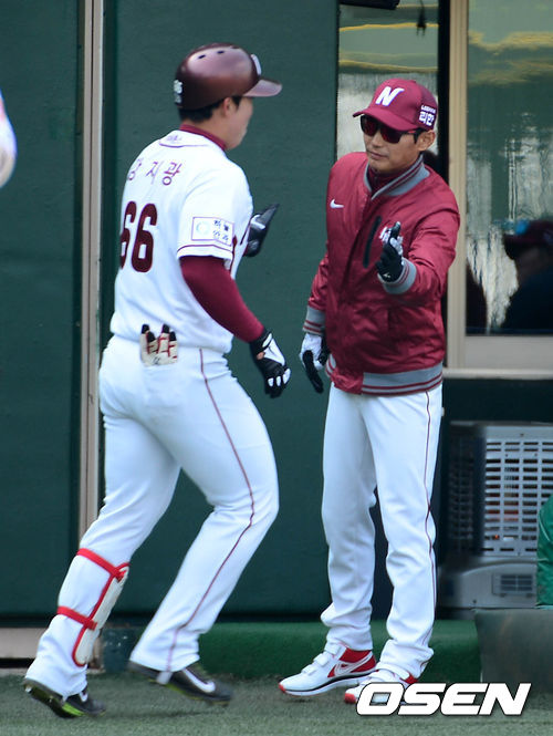 3회말 무사에서 넥센 강지광이 우월 솔로 홈런을 치고 더그아웃에서 염경엽 감독과 하이파이브를 하고 있다.