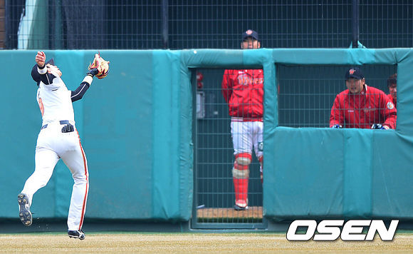 4회초 SK 공격 2사 2루 상황 임훈의 좌익수 깊은 타구를 한화 좌익수 추승우가 공을 끝까지 쫓아 잡아내고 있다.