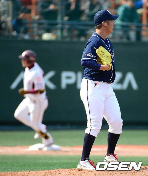 4회말 무사에서 넥센 이택근에게 좌월 솔로 홈런을 허용한 두산 유희관이 아쉬워하고 있다.
