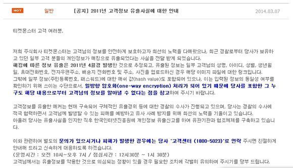 티켓몬스터는 최근 경찰로부터 2011년 4월에 발생한 것으로 추정되는 해킹에 의해 고객들의 개인정보 일부가 유출된 사실을 전달받았다고 7일 밝혔다.