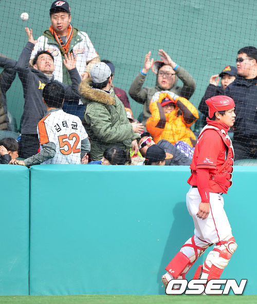 5회말 한화 공격 2사 1, 2루 상황 김회성의 파울이 홈 뒤 관중석으로 넘어가고 있다. 쫓아가봤지만 잡을 수 없게 된 SK 포수 정상호.