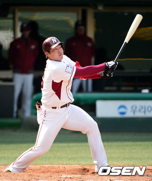 4회말 1사 만루에서 넥센 강지광이 희생플라이를 치고 있다.
