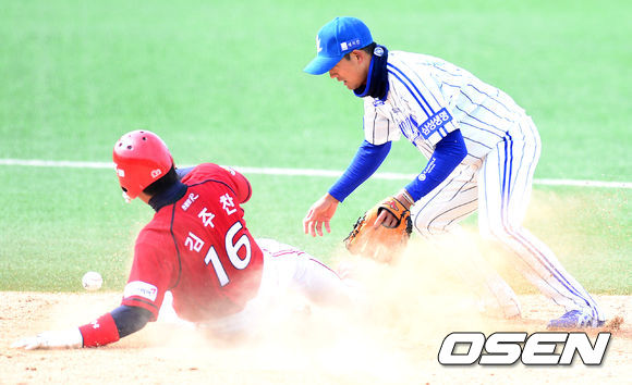 6회초 1사 1,2루에서 삼성 김상수가 KIA 강한울의 내야땅볼에 김주찬을 포스아웃시키고 볼을 떨어뜨리고 있다.