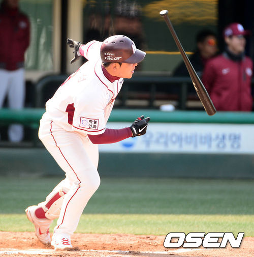 6회말 1사 1,2루에서 넥센 김민성이 역전 적시타를 치고 있다.
