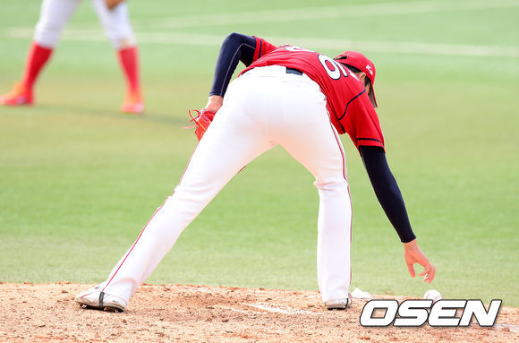 7회말 무사 1루에서 KIA 한승혁이 볼을 떨어 뜨리며 보크를 범하고 있다.