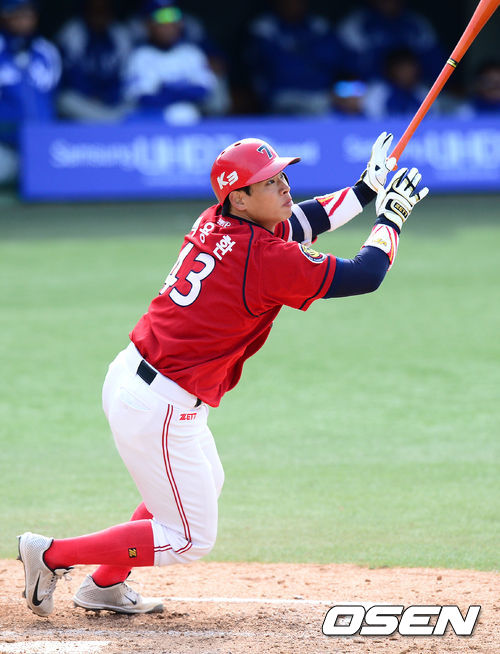 8회초 1사에서 KIA 백용환이 우익수 뒤 3루타를 날리고 있다. 백용환은 수비 실책을 틈타 홈까지 밟으며 동점에 성공.