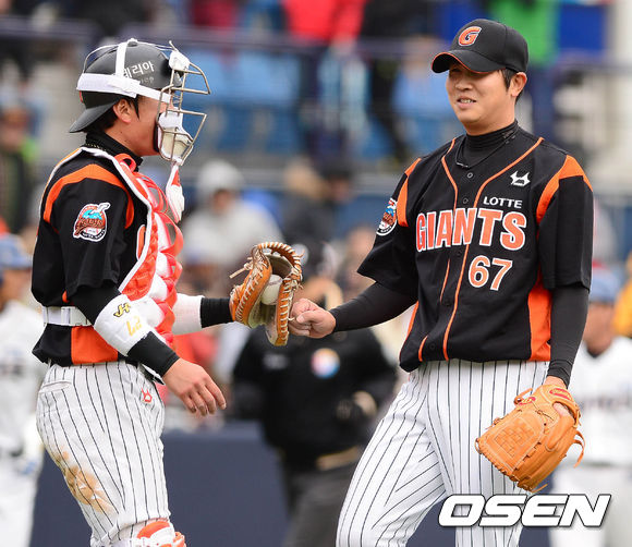 8일 오후 창원시 마산야구장에서 열린 '2014 한국야쿠르트 세븐 프로야구' 시범경기 NC 다이노스와 롯데 자이언츠의 경기 종료 후 김성배와 용덕한이 하이파이브를 하고 있다.