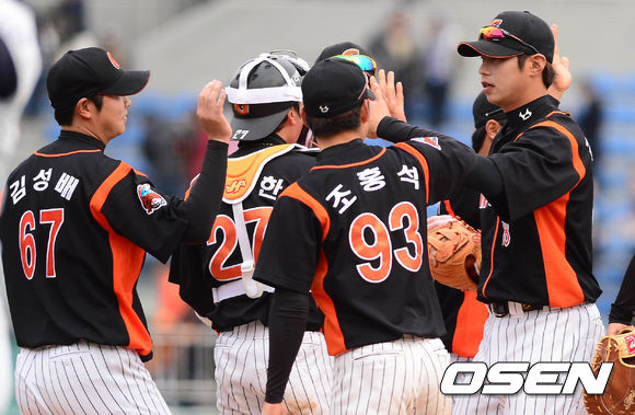 8일 오후 창원시 마산야구장에서 열린 '2014 한국야쿠르트 세븐 프로야구' 시범경기 NC 다이노스와 롯데 자이언츠의 경기 종료 후 롯데 선수들이 하이파이브를 하고 있다.