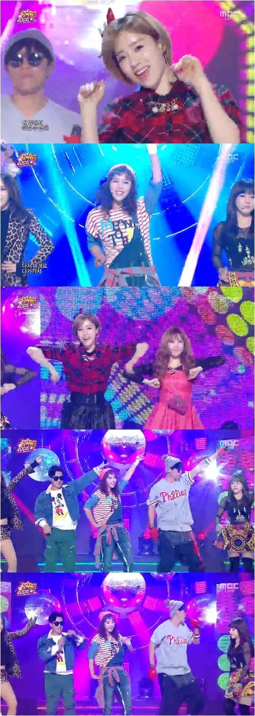 코요태와 티아라는 8일 방송된 MBC 음악프로그램 ‘쇼! 음악중심’에서 티아라의 ‘롤리 폴리’, 코요태의 ‘순정’을 함께 불렀다. 이들은 복고 음악이라는 같은 주제 하에 흥겨운 무대를 펼쳤다.