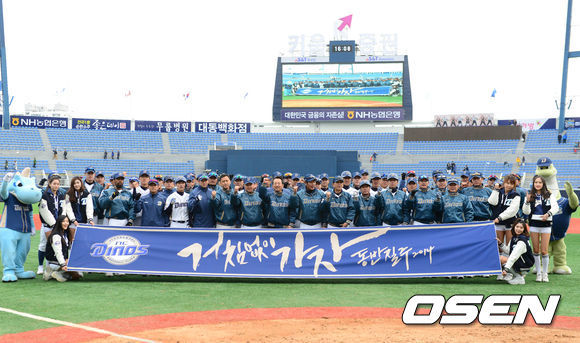 8일 오후 창원시 마산야구장에서 열린 '2014 한국야쿠르트 세븐 프로야구' 시범경기 NC 다이노스와 롯데 자이언츠의 경기 종료 후 선수단이 기념촬영을 하고 있다.