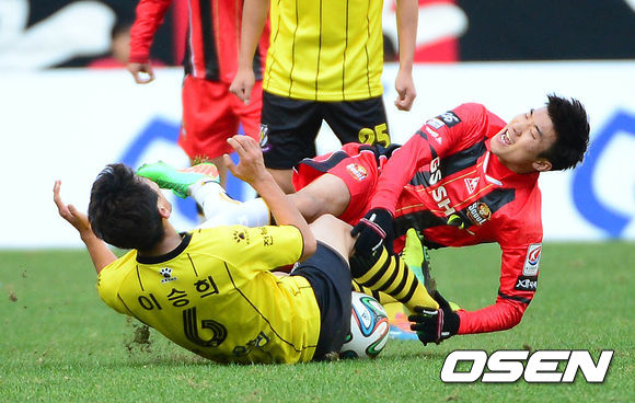 전반 서울 고요한과 전남 이승희가 볼다툼 중 충돌하고 있다.