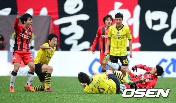 전반 서울 고요한과 전남 이승희가 볼다툼 중 충돌하고 있다.