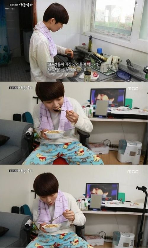 유승우는 "이렇게 하면 자취생들이 가장 즐겨먹는다는 계란밥이 완성된다"라고 말하며 의자에 앉아 밥그릇을 들고 홀로 식사를 했다.