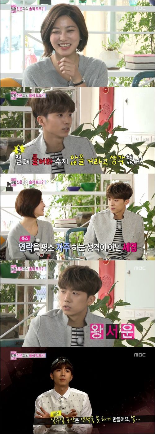 2AM 진운은 8일 방송된 MBC 예능프로그램 ‘우리 결혼했어요 시즌4’(이하 ‘우결4’)에서 우영과 박세영에게 “서로 연락을 해?”라고 물었다.