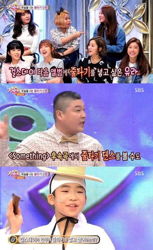 걸그룹 걸스데이 유라가 줄타기 신동의 무대를 본 뒤 걸스데이 안무를 줄 위에서 하겠다는 능청스런 공약을 내세웠다.