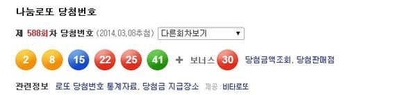 8일 나눔로또는 제588회 로또복권을 추첨한 결과 '2, 8, 15, 22, 25, 41' 6개가 1등 당첨번호로 결정됐다고 밝혔다. 2등 보너스 번호는 '30'이다.