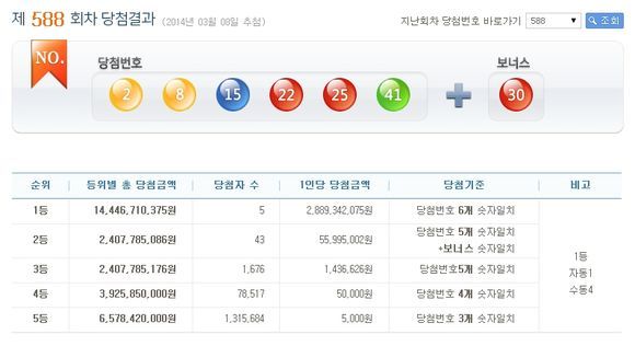 한편, 로또 588회 당첨번호 발표 소식을 접한 누리꾼들은 "로또 588회 당첨번호, 아 아깝다", "로또 588회 당첨번호, 나도 당첨되고 싶다", "로또 588회 당첨번호, 비결이 뭐지", "로또 588회 당첨번호, 다음 기회를" 등의 반응을 보였다.