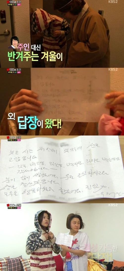 멤버들은 8일 오후 방송된 KBS 2TV 예능프로그램 '인간의 조건'에서 유해진에게 향초를 선물한 뒤 감사의 마음을 담은 답장을 받았다.