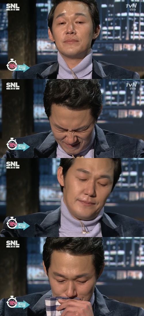 그런데 마지막에 깜짝 놀랄 반전이 일어났다. 한 시간이 넘도록 안방과 객석을 폭소케 했던 그가 갑작스레 눈물을 펑펑 쏟은 것. 연기나 콩트가 아니었다. 'SNL 코리아5'의 마지막 코너인 유희열의 '피플 업데이트' 도중 '1분의 진심'이란 순서에서 말 대신 눈물로 속내를 전한 것.